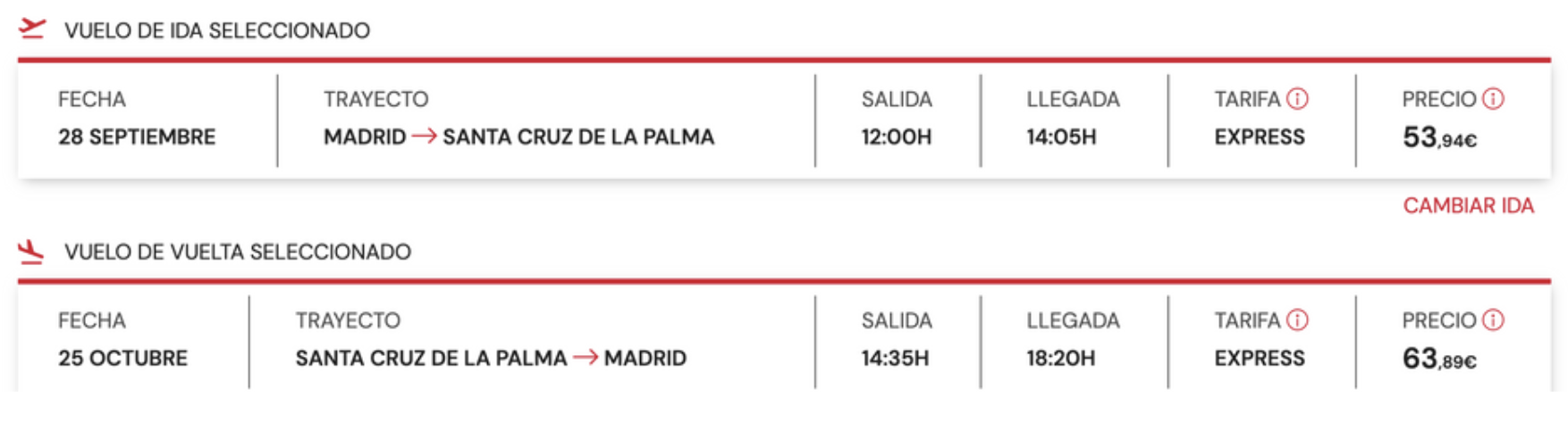 - Ejemplo de vuelos desde Madrid con Iberia Express: